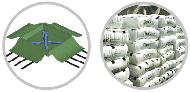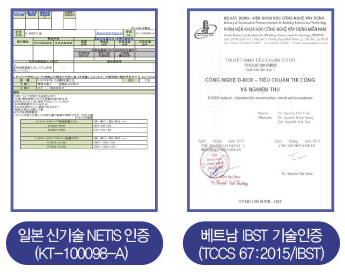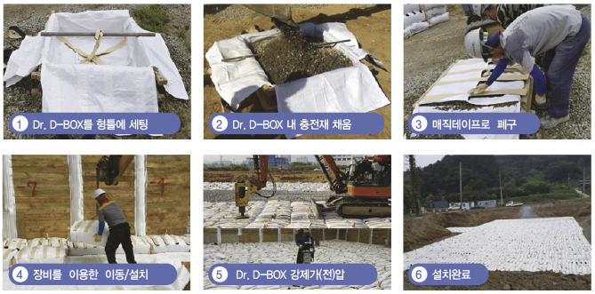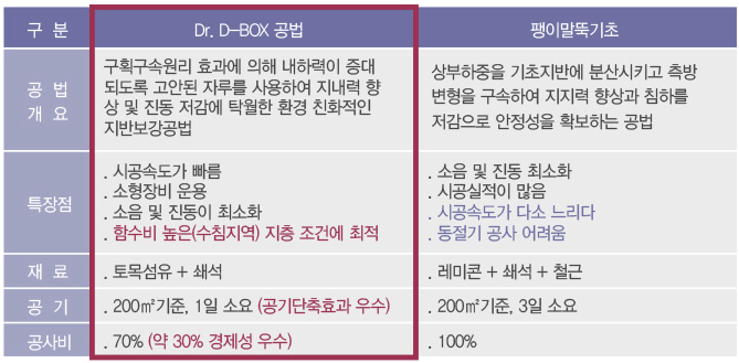 구획구속원리 효과에 의해 내하력이 증대되도록 고안된 자루(토목 섬유)를 사용하여 지내력 향상 및 진동 저감에 탁월한 환경친화적인 지반보강공법